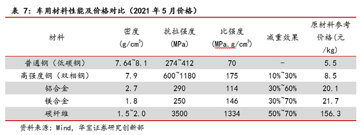 在众多轻量化材料中,镁合金的轻量化效果最好。镁合金的减重效果优于铝合金,其比强度高于铝合金和钢,其比刚度与铝合金和钢相当,减振性、磁屏蔽性远优于铝合金。此外鉴于镁合金动力学粘度低,且熔点、比热容和变相潜热均比铝低,其熔化耗能少、凝固速度快,其实际压铸周期可比铝合金短。但是由于镁价长期高于铝价,导致镁合金产品的经济性较弱,限制了镁代铝应用的进程。且镁生产企业中具备技术、资金和规模优势的企业较少,普遍资产规模较小,一线整车厂为了保证供应稳定性,主动切换为镁应用的意愿较低。