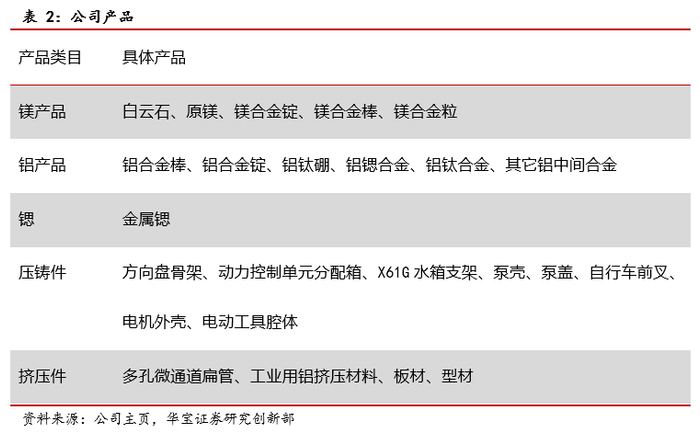 公司主要产品有六大系列,分别是镁合金、铝合金、金属锶、中间合金、压铸件和微通道扁管。镁合金产品主要包括镁合金粒、镁合金锭、镁合金棒和镁合金挤压板;铝合金产品主要包括铝合金棒和铝合金锭;中间合金则主要包括铝钛硼、铝锶合金和锌合金。压铸件主要是镁合金方向盘。公司目前铝合金总产能28.5 万吨,镁合金18 万吨,原镁10 万吨,金属锶接近3000吨。