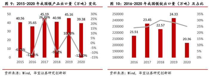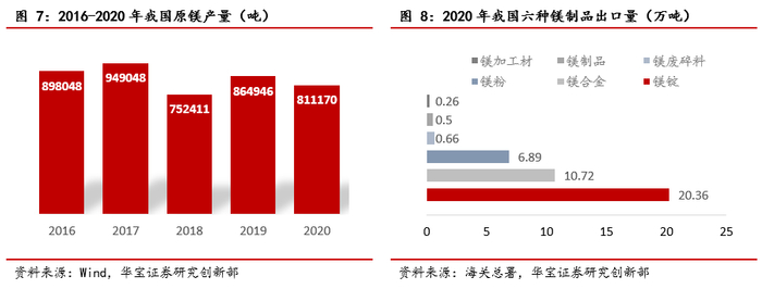 环保趋严,原镁供应端收缩。我国炼镁工业主要采取皮江法,生产过程中会产生大量三废。2011年,发改委在《产业结构调整指导目录》中将镁冶炼列入限制类名单,此后,随着环保监管越来越严和资源规划保护,行业中落后的中小产能由于工艺水平落后,生产成本高、竞争力低等因素,难以负担不断上升的环保成本,被迫陆续退出市场。此外,规模较小的企业往往盈利能力薄弱,现金流匮乏,在信贷收紧的背景下无力进行环保投资,产能被迫出清。近两年国内原镁产量略有降低,2020年同比降低6.22%,供应端收缩,未来原镁产能增加有限。