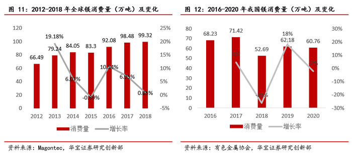 我国也是全球原镁消费第一大国。根据Magontec统计数据显示,全球原镁消费量自2000年以来整体步入上涨周期,2000-2009年全球原镁消费复合增长率为4.5%,2009-2018年全球原镁消费量增长更为迅速,年均复合增长率达到了7.9%。2018年,由于海外原镁市场需求略有收缩,导致原镁消费量增速下降,全球原镁消费量约为99.32万吨,增速下滑至0.85%。2018年在海外原镁消费略显疲软行情下,国内原镁消费量为52.69万吨,占全球总消费量约53%,保持全球第一原镁消费大国地位。中国原镁消费在全球的占比逐年提升,2019年及2020年达到62.18万吨及60.76万吨,伴随国内镁合金市场景气上行,未来消费占比全球有望达到55%以上。