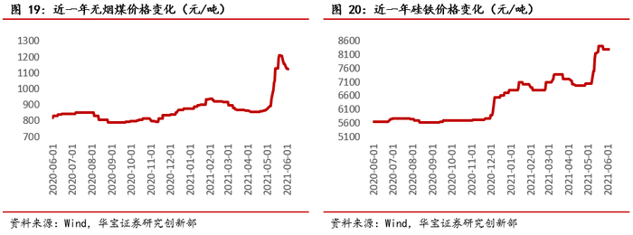 需求稳中有升,原材料成本推涨原镁价格。2020上半年国内原镁年均价为13716元/吨,同比下跌18.4%,主要因疫情影响,镁锭国内外需求均呈弱势。2020年10月份陕西榆林镁业成立叠加政策资金支持,提振市场信心,镁价自10月以来有所回升。2021年5月镁价为19733元/吨,主要因生产成本上涨,煤炭、硅铁价格目前在持续上升,目前已经开始对镁的成本产生影响,镁价中枢也因此开始上升,预计下半年原料成本对镁价支撑较强。