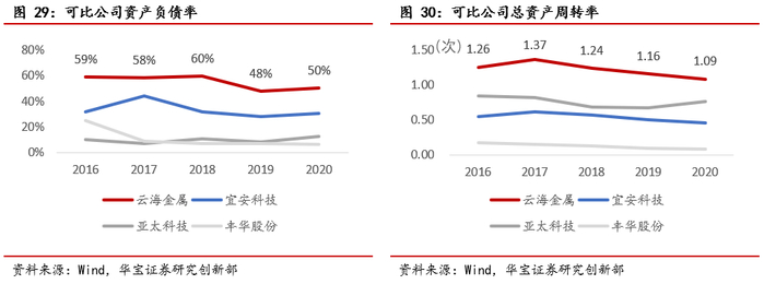 公司的资产负债率一直维持在50%~60%左右,2019年资产负债率为47.76%,2020年资产负债率为50.38%,属于正常水平。2016年~2020年,公司的总资产周转率一直大于1,2020年总资产周转率为108.98%,2019年总资产周转率为108.81%,远高于亚太科技的70.32%、宜安科技的50.48%、丰华股份的9.77%,说明公司运营效率较高。截止2020年度,云海金属的应收账款周转率为5.12,存货周转率是7.15,应收账款和存货较低这说明公司库存压力较小,回款及时,资金压力小,云海金属债务负担较轻,整体经营获现能力和偿债能力较强。