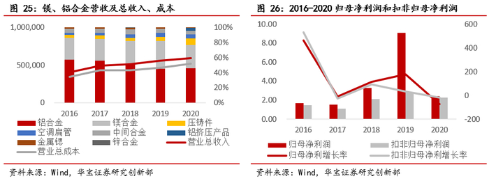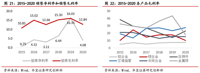 公司以镁、铝合金产品为主,铝产品营收占总收入比重更高,但公司总体营收的增长以及利润的主要来源是镁合金产品。2015年至2019年,公司镁合金对营收增长贡献不断增加,最高达96%,利润贡献也平均维持在34%,20年受市场行情影响有所下降。但2020年公司方向盘骨架、仪表盘支架、中控支架、座椅支架等镁质汽车零部件产品业务量上涨,且未来有持续上涨的趋势,镁市场占有率的进一步将提升成为公司新的利润增长点。此外,2020年公司的空调微通道扁管产品销量同比增长,稳固了在汽车空调市场的主导地位,同时重点开发汽车特别是新能源汽车铝质车身结构件用挤压型材产品,形成新的增量;铝挤压产品也有了进一步发展,贡献2.25亿营收,同比增长3.79%;压铸产品由于附加值的增加,毛利率也同比增 8.8pct至 23.1%。。