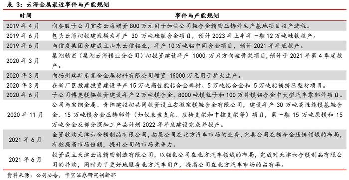 2020年11月,公司与宝钢金属、青阳建投拟共同投资设立安徽宝镁轻合金有限公司,建设年产30万吨高性能镁基轻合金、15万吨镁合金压铸部件(如仪表盘支架、座椅支架和中控支架等)项目,以及部分挤压或轧制等就变形材料。双方战略布局协同,共同整合产业,不仅在客户资源上实现共享,共同开发镁、铝合金新的应用和新的客户,还同时利用公司在原镁和镁合金以及深加工的技术优势,快速发展镁铝深加工行业,推动汽车轻量化产业的发展。宝钢金属持股比例增加,可见战略股东打造“中国镁业”的决心,未来资源导入或加速。