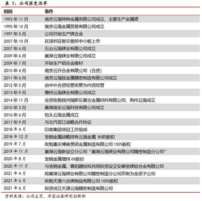 云海金属集团1993年成立,从1997年公司就开始涉及镁领域,于2007年在深交所上市,之后在2009年开始生产铝合金棒材,在2011年开始进入下游压铸件行业。公司经过二十多年的发展,成长为一家集矿业开采、有色金属冶炼与加工为一体的高新技术企业。集团在江苏、山西、安徽、广东、湖北及内蒙古等地设有10余家子公司,产品广泛应用于交通工具、3C电子及航空航天等行业。面向未来,云海金属集团把握机遇、乘势而为,依托镁、铝、锶等原材料领域的领先优势,积极向深加工领域发展,打造具有国际竞争力的全产业链公司。