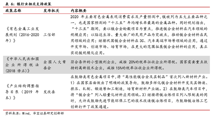 镁合金产业作为国家战略新兴产业,受到国家高度重视,“十三五”规划中明确指出推进镁合金材料在汽车领域的规模应用。此外,镁行业中的众多高新技术企业、小微企业,可享受低税率等政策优惠。