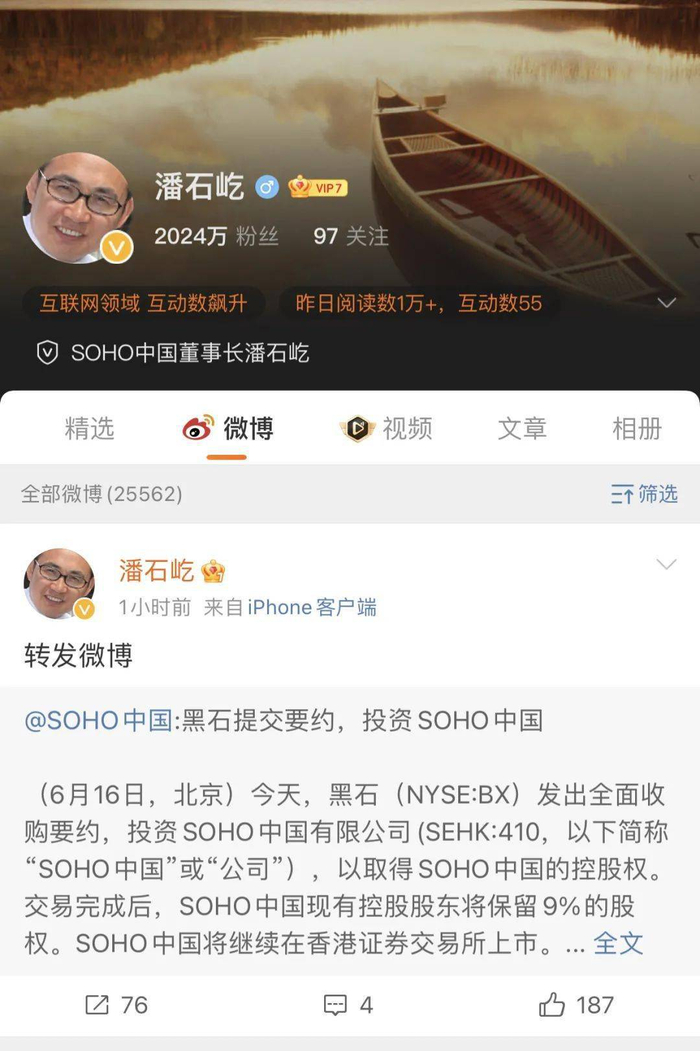 6月16日晚公告发出后,潘石屹第一时间在微博上转发了SOHO中国的官宣微博,没有任何配文。