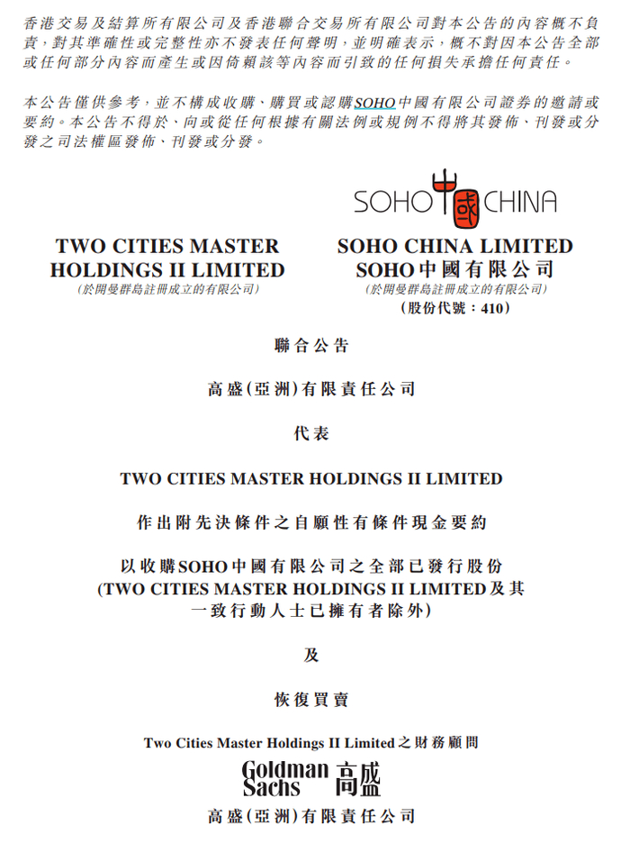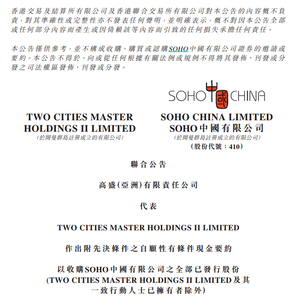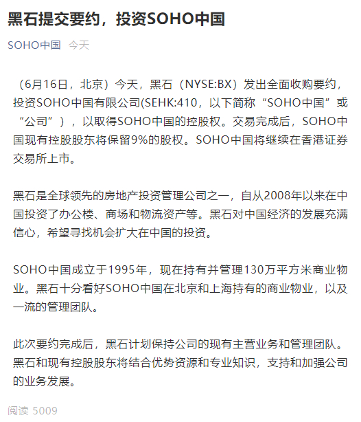 6月16日晚,SOHO中国发布公告,黑石发出全面收购要约,投资SOHO中国,以取得SOHO中国的控股权。交易完成后,SOHO中国现有控股股东将保留9%的股权,将继续在香港证券交易所上市。