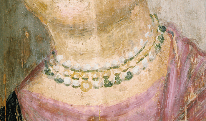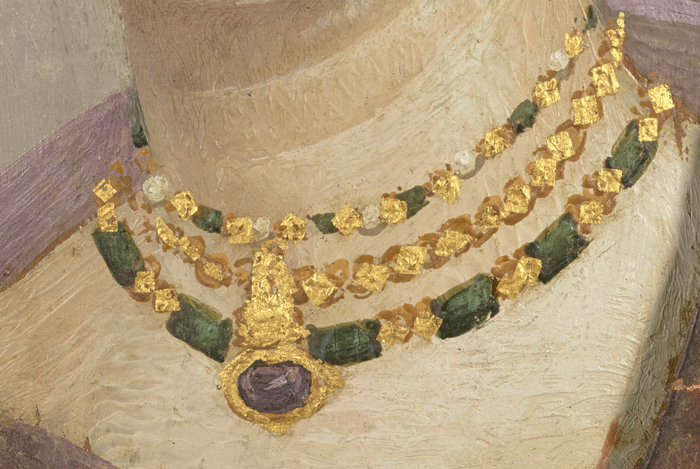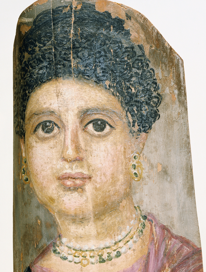 《一个女性木乃伊肖像画》(细节),公元175-200年,蛋彩画。The J. Paul Getty Museum,79.AP.129。