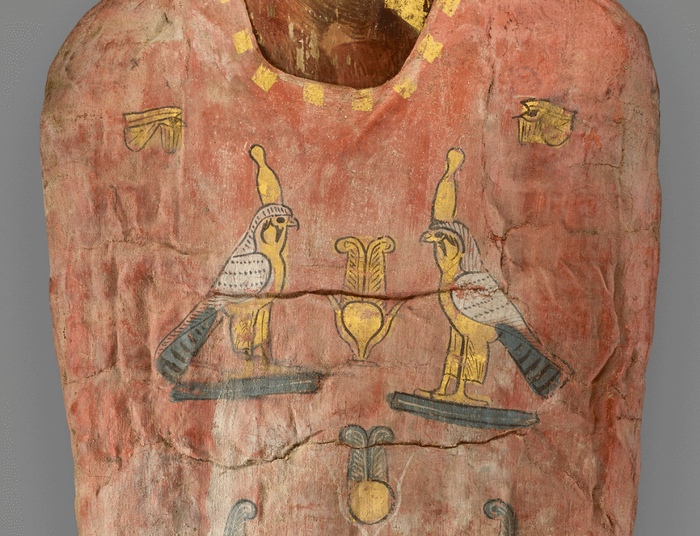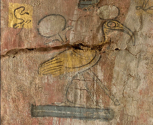 在Herakleides腹部和亚麻布之间,还有一只木乃伊化的朱鹭鸟,这种古埃及涉水鸟在当时代表着智慧、月亮、数学、医药之神托特Thoth。这更加证明了Herakleides的身份,因为当时只有受到高度尊敬的人,才能在逝世后由朱鹭鸟陪伴。