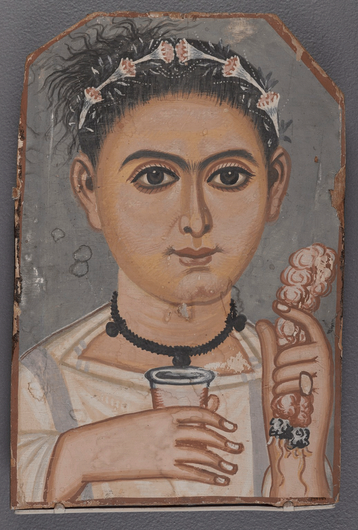 等模特去世被制成木乃伊后,肖像画在葬礼上充当“照片”的作用,之后再置于逝者木乃伊面孔的包裹布上。由于寄托着古埃及人对永生的向往,这类画像基本都出现在当时上层社会里。