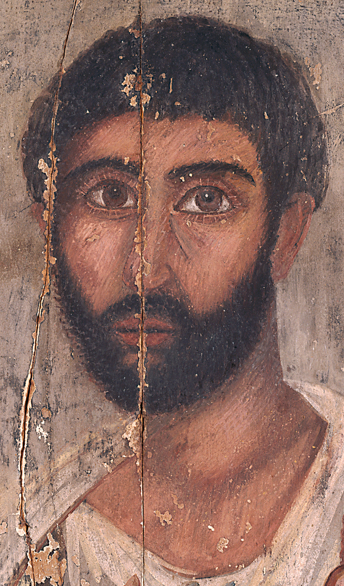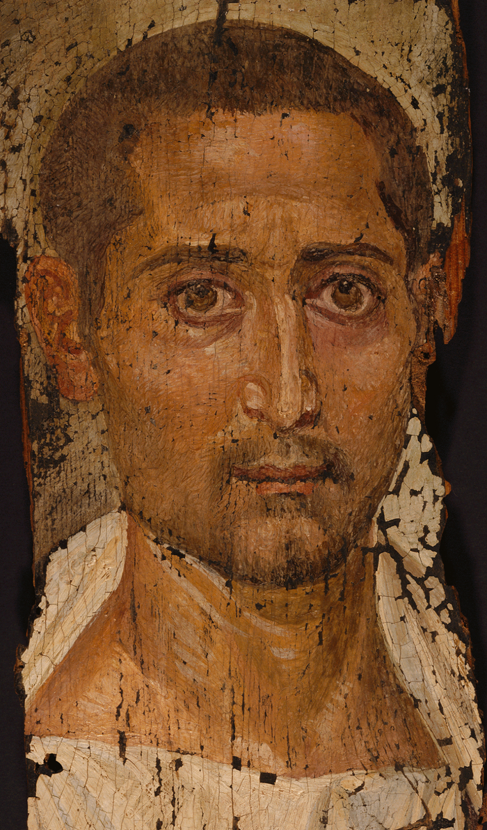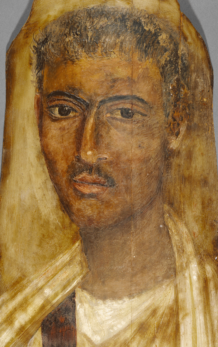 《一个男士的木乃伊肖像画》(细节),公元100-125年,热蜡绘画。The J. Paul Getty Museum,71.AP.72,现展出于盖蒂别墅105陈列室。