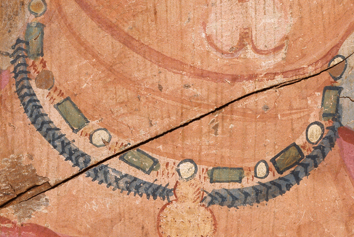 这一时期佩戴珍珠和祖母绿的首饰也非常流行,如前文提到的Isidora和这位女士。珍珠在古埃及非常罕见,它们从波斯进口而来,也因此,配饰上珍珠的大小、位置是当时人们财富的重要标志。