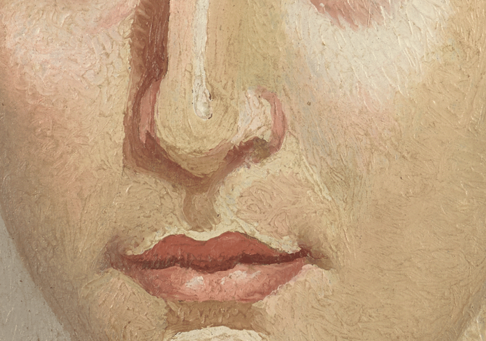 画家用黄棕色、粉红色、铜矿物绿和铅白等四种颜色描绘了Isidora的唇部,又使用锯齿形涂抹的方法细腻地描绘出Isidora的脖颈,营造出光影美感。