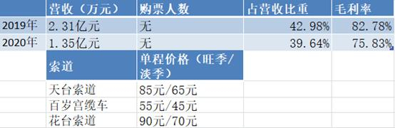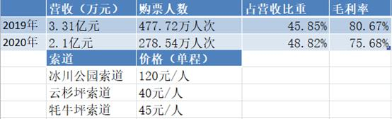 然而,并非所有景区都能幸运“躲开”索道价格调整。2018年9月,丽江股份将玉龙雪山索道票价从180元调整为120元,云杉坪索道和牦牛坪索道票价分别降至40元和45元。2019年,丽江股份索道业务游客接待人次增长了29.32%,但营收同比下滑15.09%至3.31亿元,毛利率减少3.57%至80.67%。