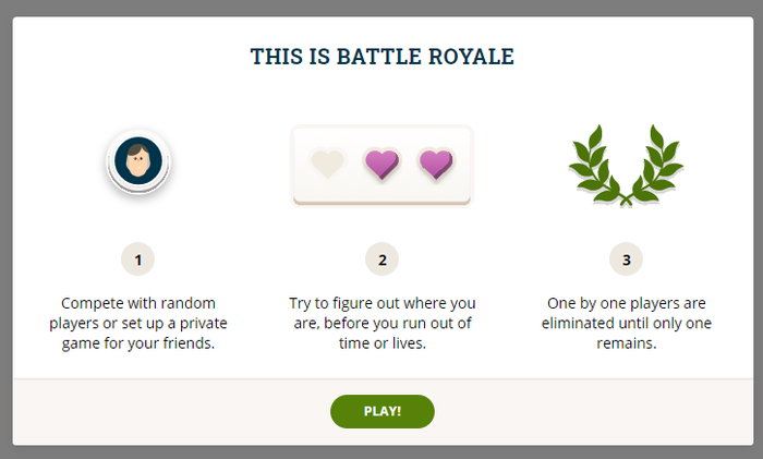 而正好在几个月前,《Geoguessr》做出了一次重要的更新,为游戏加入了“Battle Royale“模式,也就是”大逃杀“。