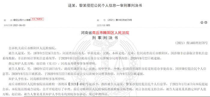 法院裁定,逯某和黎某均犯侵犯公民个人信息罪,判处徒刑3年以上,共处罚金45万元,违法所得上缴国库。