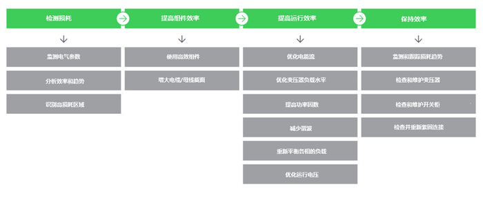 技术性损耗缘由复杂,那么,应如何最大程度地降低此类损耗呢?施耐德电气指出:改善技术性损耗应从以下四点入手:检测损耗、提高组件效率、提高运行效率、保持效率。