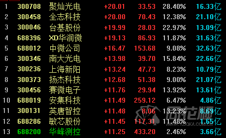 今日午后半导体产业链爆发涨停潮,截至收盘,国家大基金持股第三代半导体中芯国际概念等相关芯片板块指数居两市涨幅前列。板块内聚灿光电台基股份20%涨停,三安光电奥海科技露笑科技北方华创等逾20股涨停,华润微扬杰科技乾照光电英唐智控易事特、捷捷微电等涨超10%。