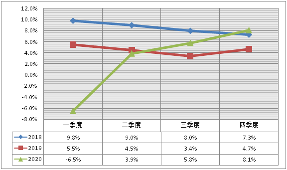 2020年各季度全社会用电量增速分别为-6.5%、3.9%、5.8%、8.1%。用电量季度变化整体趋势反映出随着疫情得到有效控制以及国家逆周期调控政策逐步落地,复工复产、复商复市持续取得明显成效,国民经济持续稳定恢复。