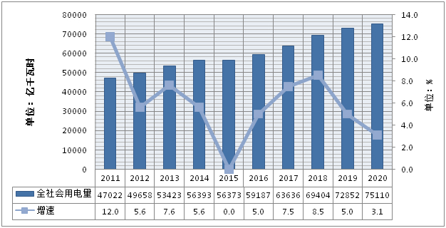 2020年,我国全社会用电量平稳增长,增速略缓。根据中电联数据,2020年,全社会用电量75110亿千瓦时,同比增长3.1%。受疫情影响,2020年电力需求和电力供应都出现了诸多变数,呈现出不确定性,尤其是第二、三产业受冲击较大。下半年随着复工复产、复商复市持续推进,用电需求较快回升。
