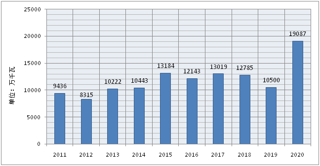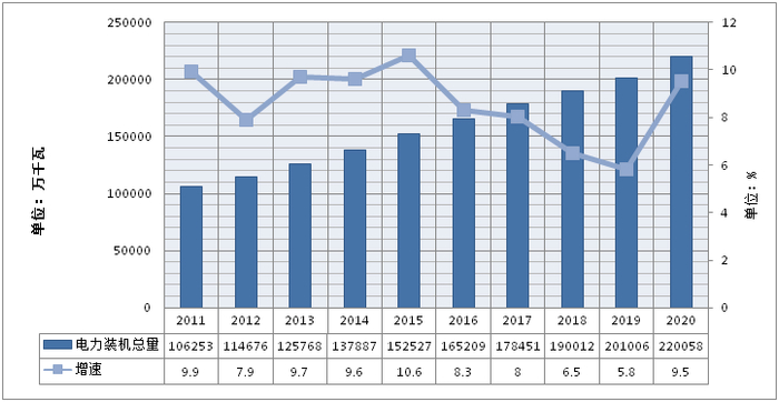 根据中电联发布的数据显示,截至2020年底,全国全口径发电装机容量22亿千瓦,同比增长9.5%,增幅较上年提升3.7个百分点。2020年,全国新增发电装机容量19087万千瓦,同比增加8587万千瓦,增速大幅提升。