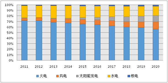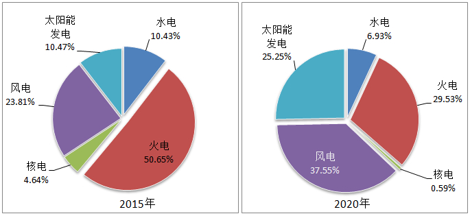 截至2020年底,全国全口径火电装机容量12.5亿千瓦、水电3.7亿千瓦、核电4989万千瓦、并网风电2.8亿千瓦、并网太阳能发电装机2.5亿千瓦、生物质发电2952万千瓦。
