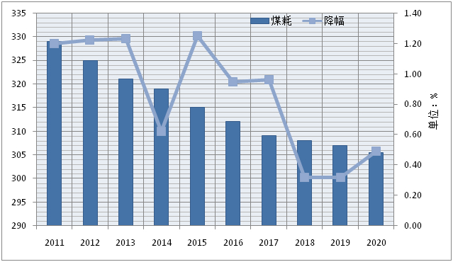 供电标准煤耗持续下降。据国家能源局发布的数据,2020年全国供电标准煤耗305.5克/千瓦时,同比再降0.9克/千瓦时,十年累计下降了23.5克/千瓦时。我国燃煤机组煤耗已连续四年优于《电力发展“十三五”规划》中“燃煤发电机组经改造平均供电煤耗低于310克标准煤/千瓦时”的规划目标。