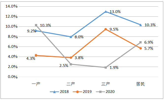 注:2018年3月,国家统计局《关于修订<三次产业划分规定(2012)>的通知》明确将“农、林、牧、渔服务业”调整到第三产业后,再更名为“农、林、牧、渔专业及辅助性活动”,电力行业按照最新的标准开展行业统计工作,为保证数据可比,2017年之后的数据已根据新标准重新分类