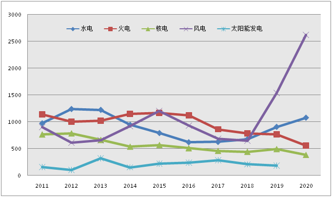 表5-3 2011~2020年各类发电新增装机情况(单位:万千瓦)