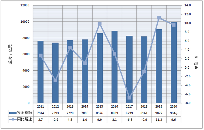 从近十年数据来看,电力投资总体呈增长态势,“十二五”期间年均投资约为7800亿元,“十三五”期间年均投资约为8800亿元。2020年是近十年电力投资的最高水平,2012年电力投资7393亿元为近十年最低。