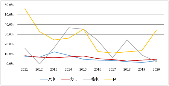 从装机增速看,2020年,火电装机同比增长4.7%,较上年增速高出0.7个百分点。风电装机同比增长34.6%,较上年增速提升21个百分点。太阳能发电以24.1%的速度增长,较上年增速高出7个百分点。核电增速收缩,降低6.7个百分点。水电装机低速缓增,同比增长3.4%。
