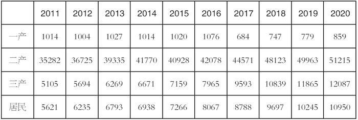 表5-4 2011~2020年分产业用电量(单位:亿千瓦时)