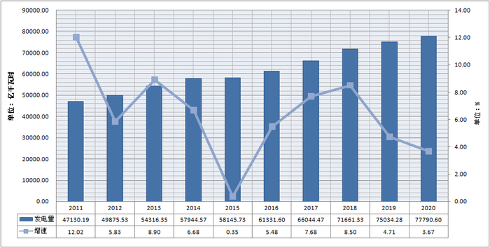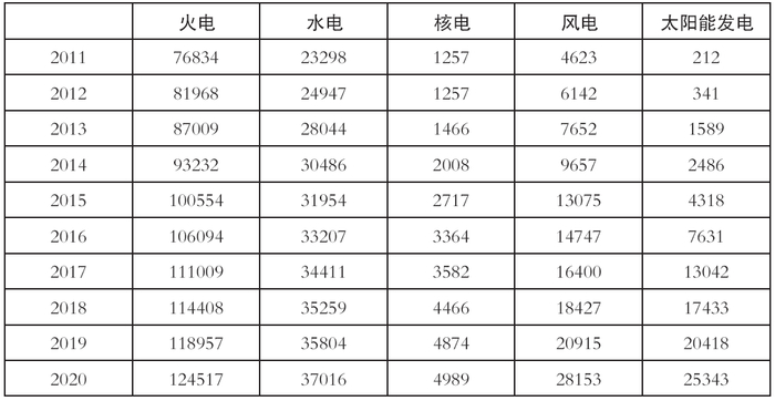 表5-1 2011~2020年全国发电量结构(单位:亿千瓦时)