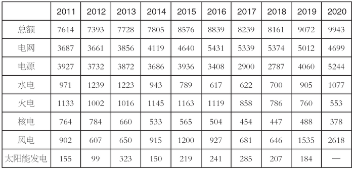 表5-10 2011~2020年全国电力投资情况(单位:亿元)