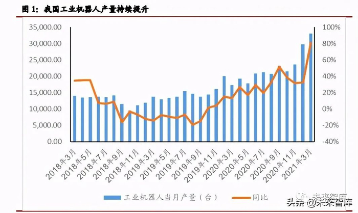 我国工业机器人产量自 2019 年 10 月走出 2018 年 9 月以来的低迷负增长阶段,期间虽在 2020 年初受到新冠疫情影响,但不改行 业整体复苏态势,行业自 2019 年 10 月以来,产量同比增速屡创新高,2021 年 3 月工业机器人产量为 3.3 万台,同比增长 80.8%。