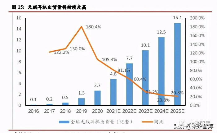 无线耳机渗透率仍较低,未来 3C 行业占比有望再次提升。自 2016 年苹果推出 Airpods 无线耳机以来,全球无线耳机出货量始终保持三位数增长态势,2020 年 全球无线耳机出货量为 2.7 亿套,同比增长 105.4%。我们认为,目前无线耳机 的渗透率仍较低,随着未来技术愈发成熟以及价格逐渐降低,无线耳机出货量持 续增加将带动 3C 行业对工业机器人新的需求,成为工业机器人新的增长点。