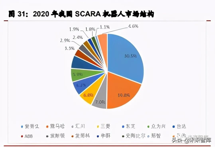 爱普生、雅马哈占据市场半壁江山,汇川为国产龙头。目前我国 SCARA 机器人 市场已基本形成由爱普生、雅马哈两家外资企业主导的格局,2020 年两家企业合 计占据中国市场份额的 50%,其中爱普生自 2011 年起一直保持全球 SCARA 机 器人市占率第一名,是全球范围内行业绝对龙头。国内企业由于起步较晚,从出 货量上来看国内企业市场规模较小,其中汇川技术是内资龙头企业,2020 年出货 量达到 3535 台,占比约为 7%。
