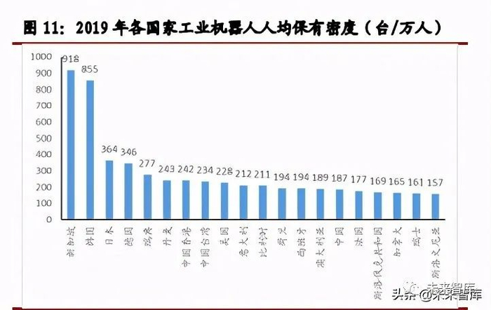 虽然我国是全球工业机器人销量第一大国,但保有密度仍较低。虽然我国 2019 年工业机器人销量达到了 14.05 万台,占据全球销量的 37.67%,继续保持全球 工业机器人供应第一大国的位置。但从世界主要国家工业机器人人均保有密度来 看,作为目前全球工业机器人保有量密度最高的新加坡已经达到了 918 台/万人, 相比之下,2019 年我国工业机器人保有密度虽较去年提升 47 台/万人,达到 187 台/万人,但仍远低于韩国(855)、日本(364)、德国(346)等较发达国家,未 来国内工业机器人仍有巨大的增量空间。