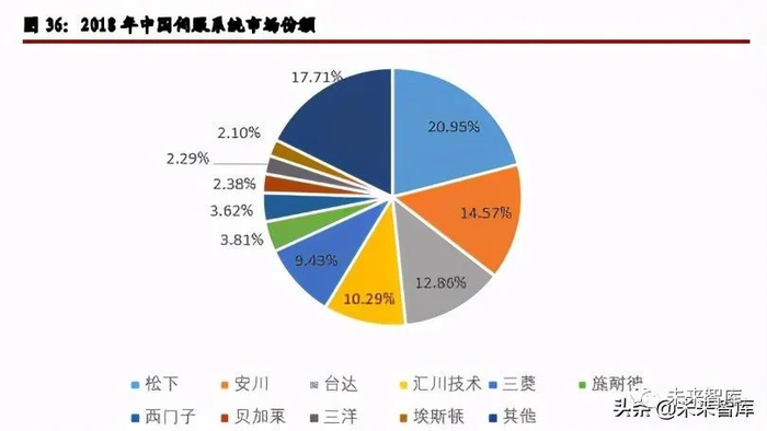 国产工业机器人用伺服系统市场占比为 22.34%,绝大部分市场份额仍由外资占 据。2018 年以日本松下、安川、三菱等为代表的日系品牌占据国内伺服系统全 部市场份额的 47%左右,西门子、博世力士乐、贝加莱(B&R)等欧美系品牌主要 把握高端市场。国产品牌在技术储备、产品性能、质量上与国外品牌存在较大差 距。但近年来伺服系统的本土化生产速度不断加快,汇川技术、埃斯顿、雷赛智 能等国产品牌快速发展,市场份额占比稳步提升。