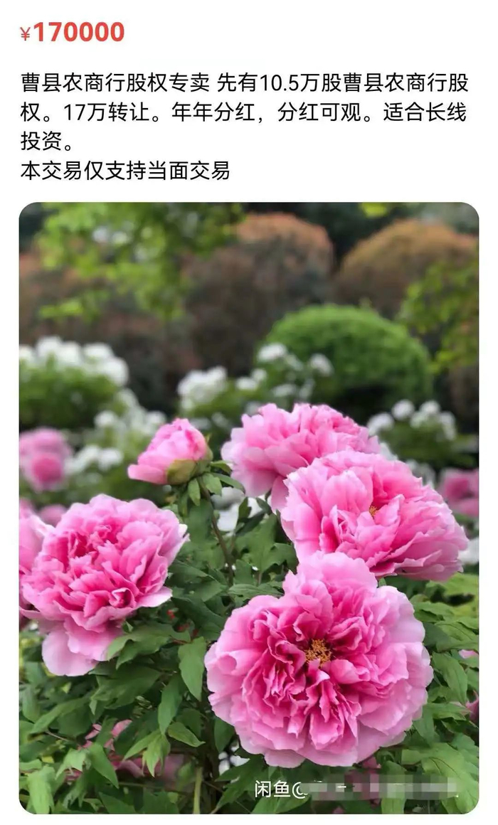 “转让岑溪农村商业银行股金50万股个人股。2021年分红归你!”“现有10.5万股曹县农商行股权。17万转让。年年分红,分红可观。”