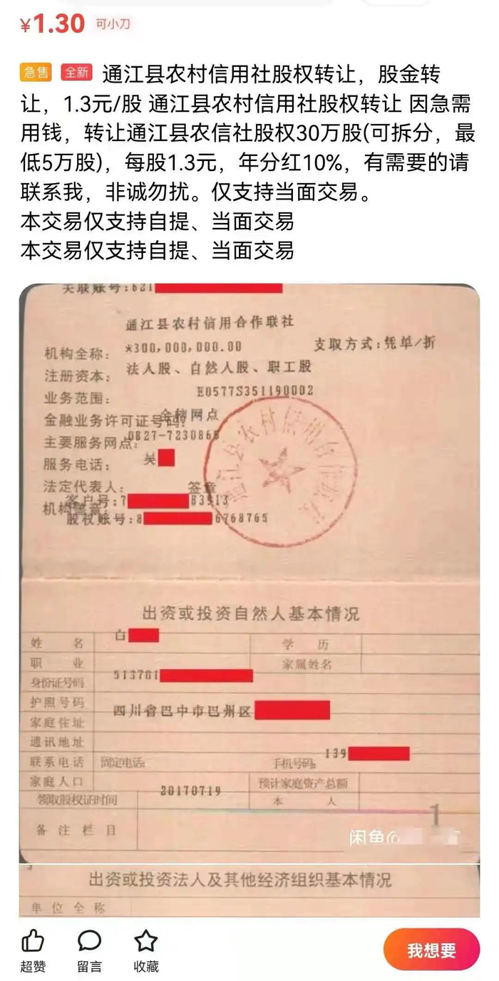 在闲鱼上,只有你想不到没有你买不到。除了大额存单转让,还有银行原始股在二手平台上待价而沽。据观察,被出售转让的股份多来自农商行、村镇银行、信用社等机构,比如岳池农商银行、义乌农商银行、兰州农商行、广西农村信用社等。