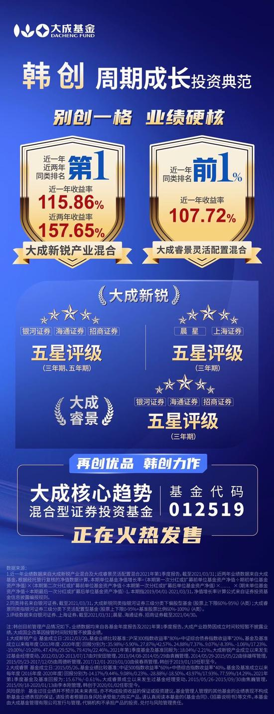 全五星基金经理韩创为大成基金的周期成长投资典范,近一年同类排名第一,近一年收益率高达115.86%,近两年收益率157.65%。