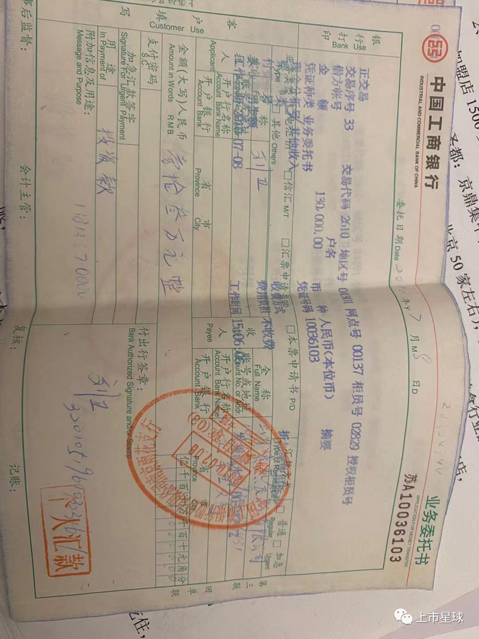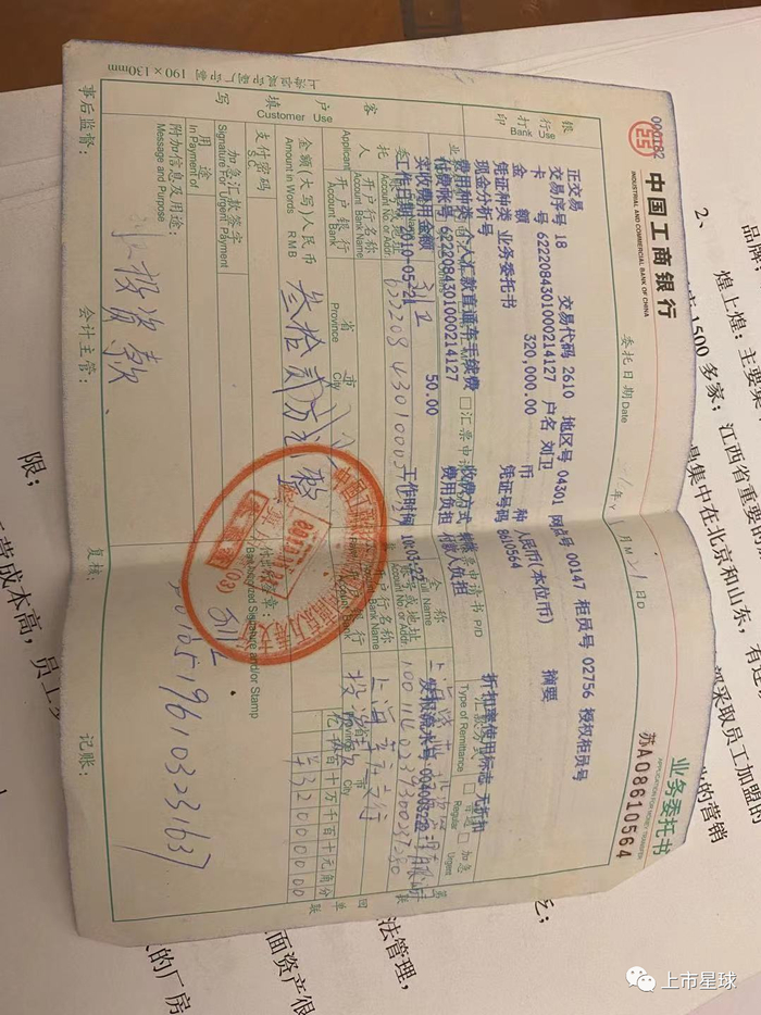 刘卫本人向《上市星球》出示了2份向上海紫燕食品有限公司出资的汇款凭证,两份凭证显示的日期分别为,2010年5月21日和2010年7月8日,金额分别为32万元和13万元,委托人一栏均为“刘卫”,收款人均为“上海紫燕食品有限公司”,用途一栏均显示为“投资款”。