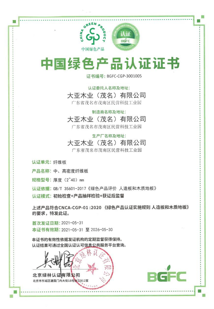 基于此,大亚人造板委托北京绿林认证有限公司(简称“绿林认证”,英文简称“BGFC”,是经国家认证认可监督管理委员会批准的专业认证机构)对旗下七家工厂的人造板产品进行绿色产品认证。绿林认证依据相关标准对大亚人造板的产品进行了详细评估,安排专业人士对工厂进行初始检查和产品抽检,最终大亚人造板旗下七家工厂均得到了专业认可,获得中国绿色产品认证证书。