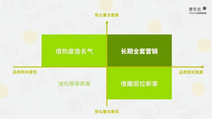 品牌的资源和试错机会永远是有限的,所以综合考虑匹配度就成了大问题。我们建议品牌可以从圈层与自身受众的重合度和品类相关性这两大视角来判断匹配程度。