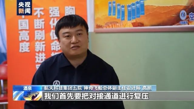 航天科技集团五院神舟飞船总体副主任设计师高旭:我们首先要把对接通道进行复压,让它的压力与两边的飞行器舱内压力达到一个平衡,这样的话航天员就可以比较方便的打开我们轨道舱的前舱门,然后进入这个对接通道。