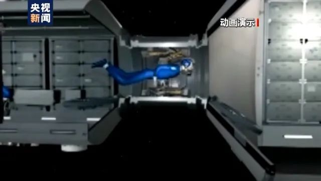 此时的航天员,由于不受重力的限制,是漂浮在对接通道里,用力将“钥匙”旋转两圈半,就能够将门推开进入节点舱。