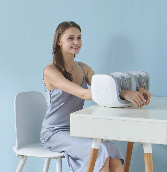 何浩明按摩仪专为关节按摩研发出六大气囊设计,3D环抱式包裹关节,多方位揉捏按压,还能恒温50℃热敷。