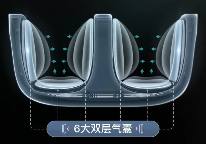 内置6个大面积气囊,能3D式环抱按摩的部位,气囊有节奏地起伏,模拟人手揉捏、按压。